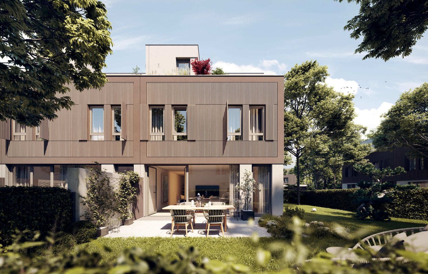 Landshut kombiniert eine warme, braune Fassadengestaltung mit markanten Akzenten in Beton-Grau. Das Zusammenspiel aus natürlichen Tönen und urbaner Materialästhetik schafft einen modernen, zugleich bodenständigen Look – ideal für Projekte mit ruhiger, klarer Formsprache.